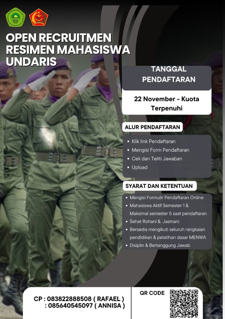UNDARIS berharap melalui rekrutmen ini akan lahir generasi baru anggota Resimen Mahasiswa yang berkarakter disiplin, berintegritas, siap mengabdi, serta mampu menjadi representasi positif mahasiswa UNDARIS.